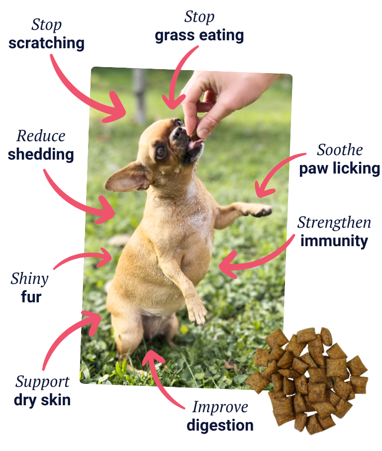Premium blend of biotin, curcuma, zinc, and algae oil works together to soothe irritated skin, stop itching, and restore your dog's natural coat shine.